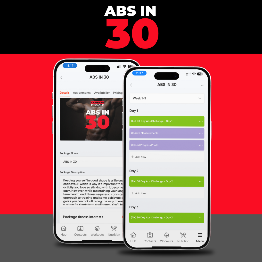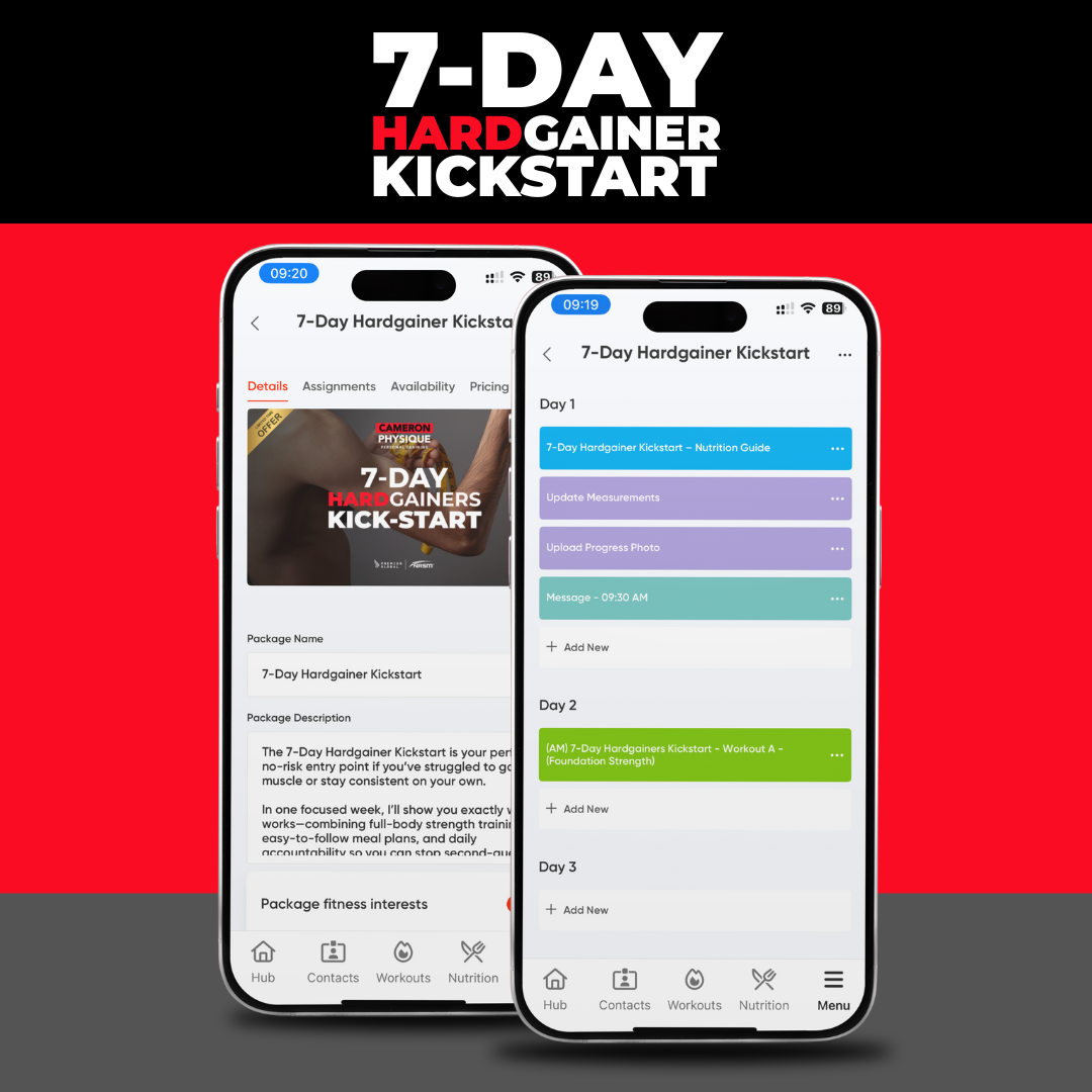 Jumpstart your transformation with a week of expert workouts, simple high-calorie nutrition, daily accountability, and direct support—all delivered by the Cameron Physique App.